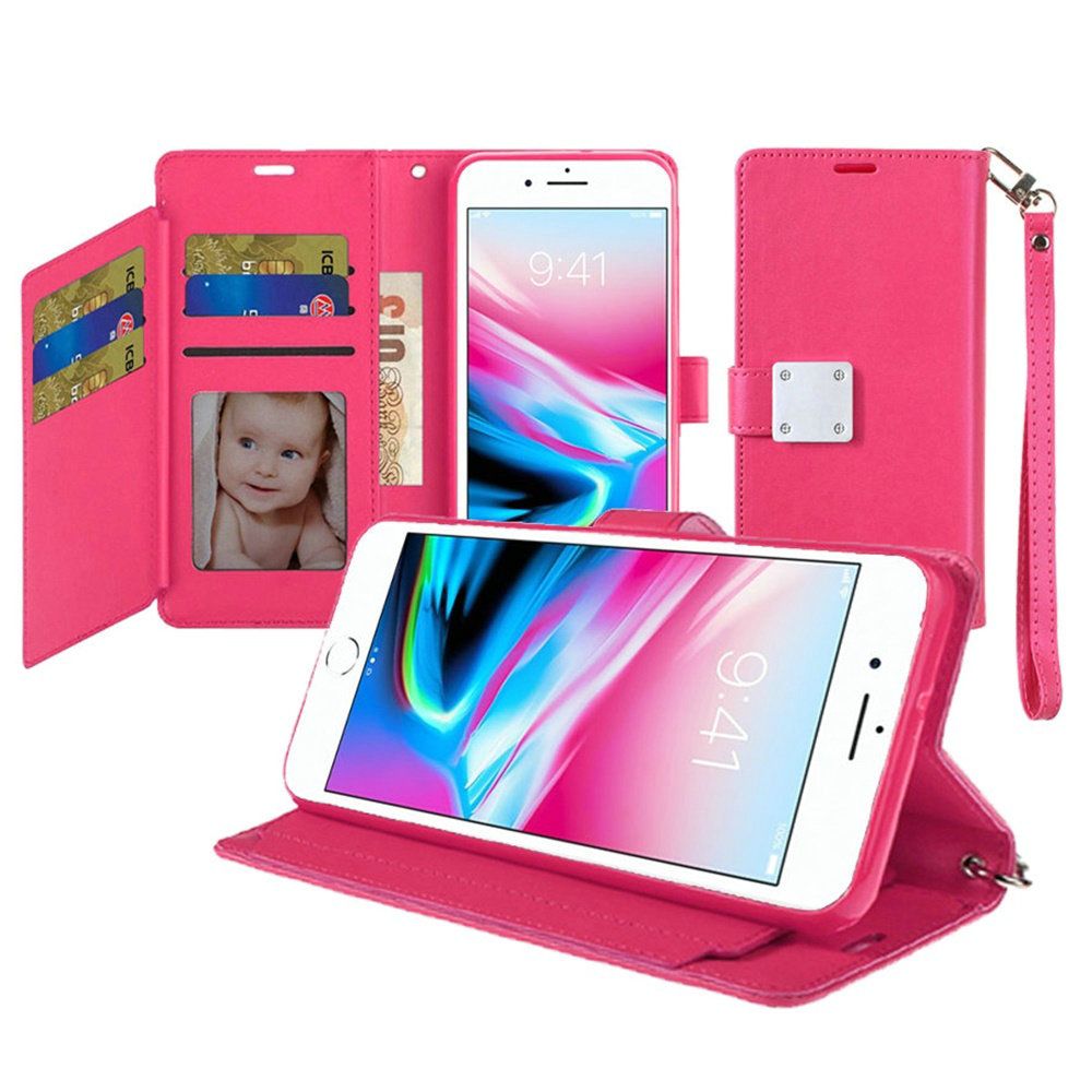 APPLE iPhone 8 Plus/7 Plus/6 Plus Wristlet Magnetic Metal Snap Wallet with Two Row Credit Card Holder - Hot Pink (9563)