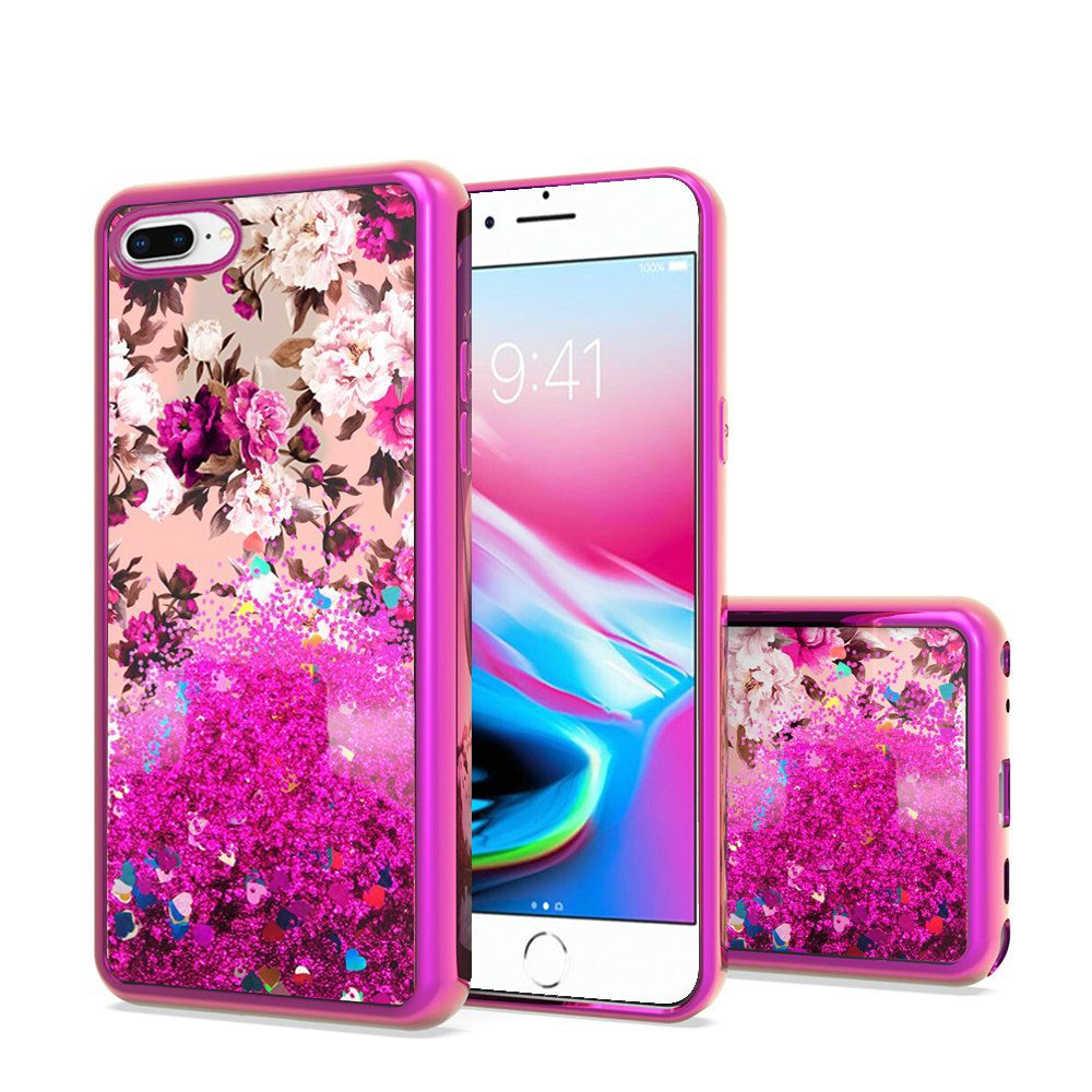 iPhone 8 Plus/7 Plus/6 Plus/6s Plus Design Water Quicksand Glitter - Rose Pink White Flower (4728)